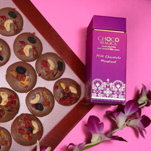 A tale hidden in every bite- the delicious, mysterious charm of Belgian dark chocolate coverture is the first chapter. Extracted from the farms of Ghana, Ivory Coast and Ecuador, these rich cocoa beans collection is here to cater well balanced flavor. As the story unfolds, feel the crunchiness of roasted almond flakes and cashews blended aptly with raspberry and strawberry. Each bite has a tempting contradiction which is bold yet delicate- a masterpiece that starts from a passion and ends up with perfection.
